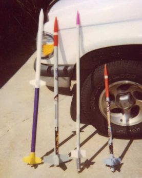 E-Qualizer is pictured with the other 3 rockets used in my NARTREK Gold project (pictured left to right are Quest-4-Estes, PipeCleaner, Mongoose, and E-Qualizer). The other three designs are all found in the EMRR website and you can read more about the NARTREK Gold project in the SPORT ROCKETRY May-June 2004 issue.