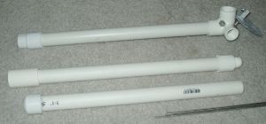The assembly of the launch pad is now complete. Now the pad can be assembled for launch or transport. For transport, stack the three PVC sections, one junction is threaded, and the other is slip fit. Insert the launch rods inside this assembly and thread the sections together.