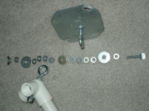 Take a look at the exploded and assembled swivel pictures. The idea is to have the thumbscrew and wing nut tighten down on the eyebolts to hold them in place, The fender washers help the assembly swivel, and the regular washers keep the thumbscrew centered in the large eyebolt openings.