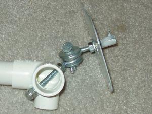 Take one of the 1/4"-20 nuts and thread it completely onto the long eyebolt and tighten. Insert the long eyebolt into the hole that was drilled into the top of the 3-way PVC junction. Lightly thread another 1/4"-20 nut onto the bottom of the eyebolt that is now protruding into the middle of the three "legs" of the junction. Do not tighten this too tight as it will crack the PVC junction. Tighten the nut until the swivel will not spin in the hole but not so tight as to crack the PVC junction. Now add the anti-vibration nut to the bottom and snug it tight to the nut already on the eyebolt. This will keep the assembly from moving.