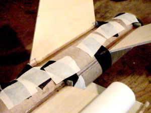 (Scratch) S.W.A.T. Upscale The fins were cut using a razor saw then epoxied through the wall to the motor mount. The slots were cut with a Dremel. The missile dowels were sharpened in a pencil sharpener then blunted and rounded. A tip (#5) from the EMRR library was tried for the fin fillets. Fillets areas were dammed at the ends with kneaded eraser then the eraser dam was taped on to further reduce the possibility of leaking. The rocket was leveled. Thinned epoxy was poured in and allowed to set. Included in this process were the fillets for the outboard fin tubes and the missiles.