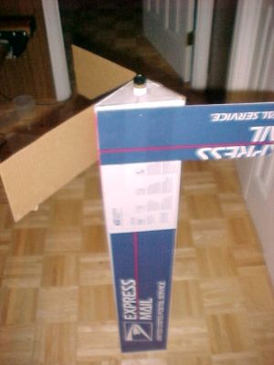 The next step is to make the nose cone. Cut about 9 inches off the end of one of the boxes. Use the end that has the flaps. Now cut the self stick flap from the side. This is the trickiest part of the build. You will need to trim the sides and "work" the fold in the middle to make it fit into the other box. The fit has to be good to ensure that the pressure doesn't leak out and fails to blow off the nose cone. When you get a good fit, use packing tape to close the end and side.