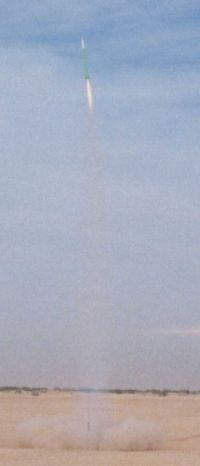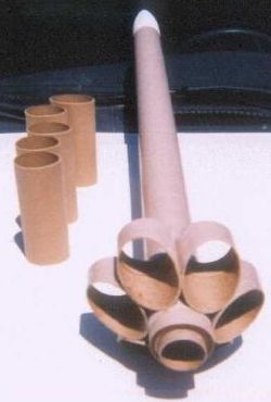 Construction was generic tubefin process using 5-minute Devcon epoxy, except that 6" x 54mm connector sections were used to double the airframe. Tubefins were cut with a 45 degree bevel on the bottom and were 3 1/4" (long side) x 1 5/16" (short side). The coupler was 1 5/16" long and did not extend into the beveled area. Tube fins were attached in pairs in the usual self-jigging fashion for tube fin rockets. Recovery system is anchored to an 8" loop of para cord, pushed through a hole drilled 4 1/2" from the top of the body tube, with the knot covered by half of a bisected Estes BT-5 nose cone. Center the 6" launch lug 6" above the tubefin can. CG at AUW should never be aft of this balance point. Long, heavy motors actually increase tubefin rocket stability. Payload bay contained 400g lead fishing sinker ballast in a plastic bag (total rocket weight empty is 1275g) for I-J flights only. A special LOC cone with 135g additional ballast is used to keep overall speed down. The Perfectflite MicroAlt altimeter used for most flights was placed loosely rolled in a piece of paper towel inside a 3" section of 29mm motor tube placed in the payload bay on top of the lead ballast. All in all, not a lot of work for a L1-L2 capable rocket.