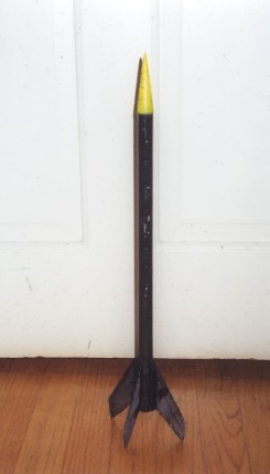 This was my first ever scratch built rocket and that is the ONLY reason I am submitting it. It has flown about 3 dozen times to date and is an 18MM minimum diameter using a full length of Estes 18mm tubing, but it gets a few inches shorter every half a year or so because of a tangled streamer. I really have to find a better recovery device for it. It also has a few spots where a fin has obviously been re-glued. This cannot have been any higher than my 12th rocket and not knowing about the importance, I used really thin balsa because it can crack on the easiest of landings. When it flys, it really soars. I am guessing about 1,500 feet or more on a C6-5 or C6-7. It goes really fast too, so I cannot tell if it is this rocket or some other rocket whenever I look at pictures.