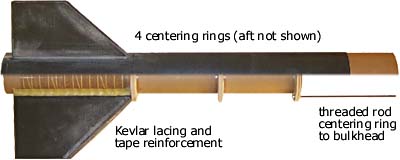In the picture above, you can see how the internal reinforcing is used. Kevlar® lacing and tape bond the fins to the motor mount tube. Four centering rings are used for strong body tube contact. Threaded rod bonds the bulkhead of the anti-zipper design to the forward centering ring.