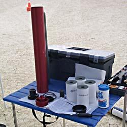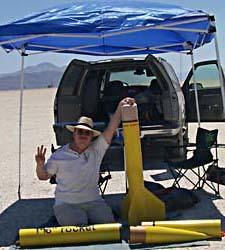 About 10:30, the winds calmed down enough for the launch and we assembled the rocket and took it to the RSO table. I had a big crew to help me carry the 47lb. rocket and load it onto the ProRail. On the left you can see the people who helped me prepare and set up the rocket: Nevin Loop, Pius Morozumi (making sure the rocket is level), Tom Rouse and Gordon Hom.