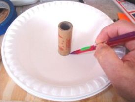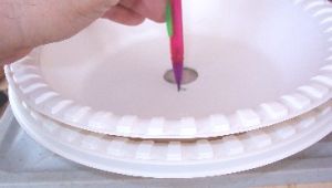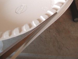 Start by trimming off the rim, where it starts to turn down, on one (and only one) of the plates with a pair of scissors. This plate will become the Top. Trimming the rim off creates a more aerodynamic shape in the finished rocket.