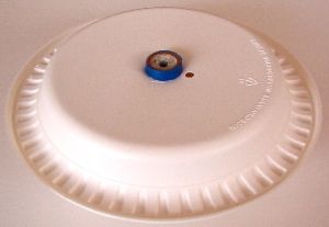 There are only 2 parts to this flying saucer shaped rocket: a Top and a Bottom. Both parts are made from Serve 'n Store® Everyday 9 inch (actually they are 8.875") plates. These are available at most grocery stores in packs of 24 for around $2.00. This works out to less than 17 cents per rocket. Only the Serve 'n (Scratch) Hefty® Serve 'n Store® Flying Saucer Store® Everyday type of plates, as pictured above, should be used. These are the white ones and come in two sizes, 9 inch and 10 inch. The 9 inch plates fit over the 24 ounce bowls of the Everyday brand. The Everyday brand plates and bowls are thicker, stronger and more impact-resistant than the red Party brand. They interlock so well that no glue is required to hold the rocket together. The photos in this article are for the 24mm motor version of the flying saucer, but the 18mm version is identical except for the size of the Motor Holes.