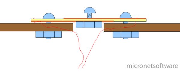 - Attach the switch to the airframe using the remaining screws. You will need to drill a larger hole under the center hole (where you soldered the nut) so the switch sits flush. You can also pass the wires through the same hole.