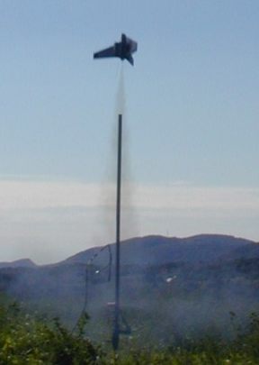 Upon landing (using the small 'chute) the lower fin broke off, due to damage on previous flight the motor tube and upper canopy were damaged. She's done!