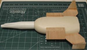 Interceptor L Now, on to the fins! This was the most challenging part of the project. I created the fins using 1/16" and 1/8" balsa. I have provided a template of my design which shows how many of each part and the corresponding thickness. Since the plastic bottle doesn't lend itself very well to sticking to glue I decided to have the fins go through the wall to the body tube. I made slots in the sides of the lotion bottle and the alignment of these slots was made easy due to the mold seams that were already in the lotion bottle. I used the ¼" thick balsa pattern for the rear body feature. This needed to be sanded down and formed to resemble the photo. I attached the fins as well as the body feature using 5-minute epoxy.