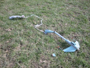 (Scratch) Klingon Targ On flight two, I decided to try the C6-3 before trying the C11. I prepped the rocket was before and launched it again. The flight seemed to be much better than the first, but the rocket had more of an arc flight to it this time, probably due to the odd gusts of wind that were blowing during the launch. Unfortunately, when the ejection charge arrived, the parachute did not fully deploy, causing the rocket to do a kind of tumble recovery. It landed on grass, but there was definite damage including a broken fin (repairable) and a major bend/tear at the neck just below the BT-60 portion of the rocket. The rocket is not flyable as is and is currently retired. I need to rethink the BT-5 since it failed on me twice. Also, I was not too pleased with the rocket's flight being squirrelly. With that in mind, the design and the rocket really need to go back to the drawing board.