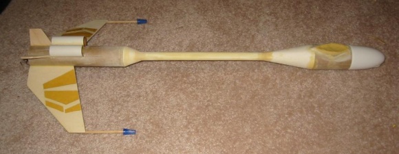 I designed the rocket in RockSim, and thus used the fin templates to help me trace the patterns on the light ply and balsa I had for the fins. The second tip I used was to use thinned yellow glue or white glue to seal the fins. I first attached the fins to the body before worrying about sealing them. Again, I was skeptical about this technique as I prefer Elmer's Fill 'n' Finish. The method works fine, but I found it to require far more than just 2 applications. More like 5 or 6 applications seem to work to fill all the grain I had in my fins.
