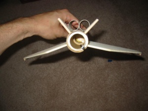 As part of the 2005 EMRR Challenge, I wanted to build a rocket based on a concept I had developed in the past few months. I also will indicate in this report the two tips that I used in my construction. I had a vision of creating a rocket based loosely on the Bird of Prey design. I began with the long thin neck, consisting of a section of BT-5. I added centering rings, and then created the paper transitions. Next, I glued the BT-60 tubing on the top of the BT-5 and glued the BT-55 on the bottom. I marked the BT-55 for fin alignment and then began working on the motor mount.