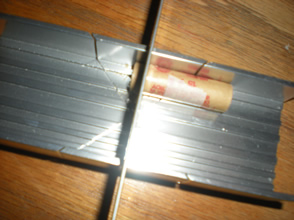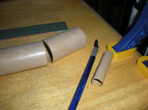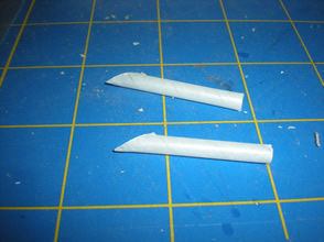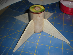 The eight fins were cut from scrap balsa. The edges were just sanded square to save time. The fins were then tacked onto the tubes with a thin layer of wood glue and allowed to dry.