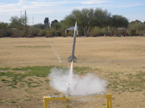 The third and final flight of the day was by far the best flight. Since launching with the wind worked out so well on the second flight, we again launched that direction. The flight was excellent. During the booster phase, the rocket straightened out and the sustainer shot straight up on the more powerful A10-3T. This was exactly what we were looking for, however, the chute did not deploy completely and now the rocket was screaming down toward the field nose cone first which was not what we were looking for.. Another lawn dart.