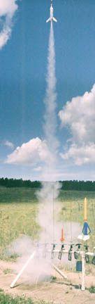 Engine retention is done by friction fit. The RockSim simulation indicates that a C11-3 will deploy a little early and a C11-5 a little late. I used a C11-5 (on 5/8/05) on the first two flights with ejection at 1 second past apogee (~450 ft). They're beautiful, perfectly straight flights but with a significant amount of spin. We're talking 10 cycles per second or so. No damage on either flight. The first was with a 21" mylar parachute, which was too big, so I went with an 18" chute for the second flight. I was able to catch the landing then. A lot of wadding is required. The heat from the ejection charge has begun to shrink the body wrap toward the top of the seam, so I'll add a little liquid CA to try to reduce or eliminate that. Also, there's a significant amount of ejection charge residue all over the body but that actually makes it look more scale, so I'm not cleaning it. Third flight was on a D12-5 (at C.R.A.S.H. on 5/21/05) with ejection just before apogee (~800 ft). The parachute was a little sticky and stuck together, hence a quick descent with one floppy fin, which was easily fixed. The fourth flight was with a C11-3 (at COSROCS on 5/28/05), and deployment was just before apogee but no chute damage occurred. It was a beautiful flight. Recommended engines are B4-2, C6-3, C11-3, C11-5, D12-5, E9-6.