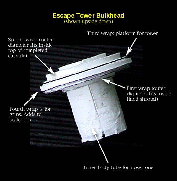 Conceptually, the most complex aspect of this model is the bulkhead that the escape tower sits on. The inner nose cone body tube is made first using a glue tab and then the smallest diameter wrap starts around it. It's got 4 different widths and hence 4 progressively larger diameters of wrapped Bristol in the following order: 1) Fit outside the bottom end of the small nosecone inner body tube and inside the base of the lined shroud surrounding that tube. 2) Fit inside the lower body tube, which is the upper end of the completed capsule. 3) Extend out to provide the mounting platform for the escape tower. 4) Provide a smaller step to give a visual reduction for a scale look. Test fit each diameter into the respective tubes and shrouds and tear off the wrap when you've achieved a good fit.