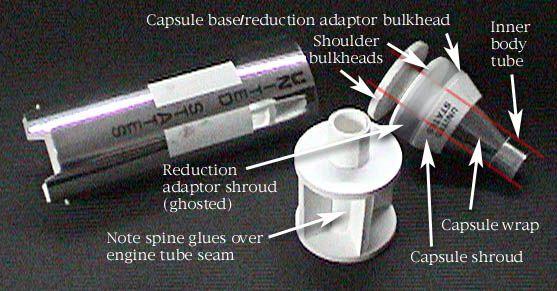 (Scratch) Little Joe 6 paper rocket Next is the Mercury capsule. It is composed of 2 identical bulkheads around which the nose cone shoulder is glued and the larger diameter of the reduction adapter abuts. A slightly smaller bulkhead is provided for the capsule base/reduction adapter joint. Sand the bulkheads smooth and round. Before beginning glue assembly, add the shoulder wrap to test fit into the main body tube and sand the shoulder bulkheads if necessary to loosen fit and accommodate the glue strip on the inside of the main body tube.
