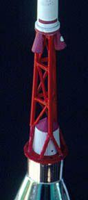 The escape tower scaffold was constructed using 1/8" dowel for the 3 main struts and toothpicks for the cross struts. The 3 main struts are 3.75" long including the split lower pieces. The prototype is very sturdy, has survived 4 flights, and looks good. It takes a couple of hours to make but the end product is worth it. However, if you're interested in trying a paper model for the first time using these plans but don't want to invest the time in the tower (or would like to put it off), you can certainly do so. It'll look and fly great without the tower.