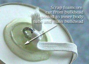 (Scratch) Little Joe 6 paper rocket One of the pieces of scrap foamcore from the bulkheads is sanded to account for the thickness of the inner body tube of the capsule and glued inside 1/16" from the lower end of the inner capsule body tube. Epoxy a screw eye into the center for one end of the 3ft shock cord and fasten the other end with a folded paper mount.