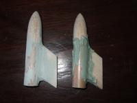 Going through the parts I opted for the 6-inch ST-20 with the balsa nose cone. This would give me a short squat rocket. I would have to go for swept back fins so I opted for three using the inch width 3/16" section of balsa. Each fin had the following dimensions: root edge 36mm, leading edge 33mm, dowel edge 60mm, and trailing edge 62mm.
