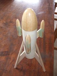 A short rocket with three clustered outboard motors, I called her Little Lil because she is little and lilac in color. Made for the box o' parts 2009 competition, I sent myself the following items as I didn't have a design in mind and just put some stuff in a box.
