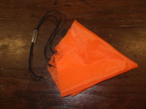 The parachute was made from rip-stop nylon. The parachute was 15 inch diameter and had 6 sides and six eyelets added. Cord was added for the shroud lines and a swivel was added at the base. I used another surprise, a pen, to make a slider to slow down the parachute's opening speed. The pen was broken apart and a half-inch section of the barrel was used. As a back up I also used the Estes 12 inch chute on some of the flights.