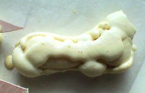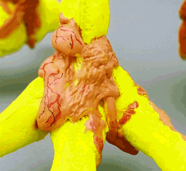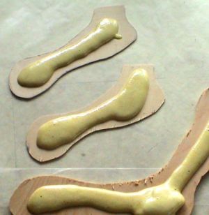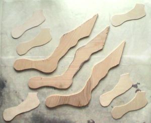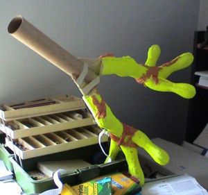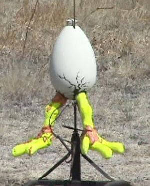 It took about 5 hours to build. The plywood was cut out with a power jigsaw, then two coats of Giant Leap Megafoam was poured on each side of the plywood. The "overfoam" was cut off all around using the plywood as a guide, then an orbital power sander was used to fine-shape the foam. Some half-cured Megafoam was dribbled around the joints where the two side "toes" are glued on. This serves as good reinforcement and also makes for a yummy "guts" look. The 29mm motor mount is a standard build, with Kevlar® shock cord. The legs were glued to the 2" scrap Christmas paper core using wood glue, which was the hardest part of the build. Slots were cut in the bottom of the plastic egg with a Dremel and the leg-and-tube assembly was slid in and glued using Gorilla glue. Each time it has landed so far, a leg needs to be glued back on.