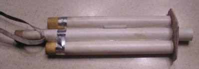 I started by cutting the BT20 tubes to length (2 @ 6.0 and 1 @ 10.0). I then cut out the bulkhead from 1/8 balsa sheet (see template). I glued the 3 tubes together side by side (see picture). I then slide the bulkhead in place and epoxied it to the tube sub-assembly. Next, I glued a launch lug in the center of the tube assembly. Finally, I attached the elastic shock cord to the main tube using 5 min epoxy to secure it in place.