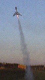 The original MACH 10 used 18mm "C" motors and I used 24mm "D" motor for the upscale (D12-0 or D12-3 works fine). Small tube with nose cone needs wadding as usual to protect streamer/parachute. Motor retention is a standard Estes clip. The model flew very straight off the rod and during climb. At burnout, the nose cone ejected and the glide started. The glide is fast as it is with the small MACH 10, although the upscale seems to have a little more stability; probably due to the larger wing and tail surface area. The model came in very steep in a tight left turn on first flight. The landing was a "Lawn-Dart" type. Although it stuck in the ground there was no discernible damage. The model can take a good lick and come back for more.