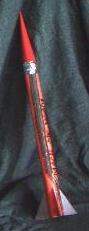 Finishing was unique for sure. Every other fin face is silvered with Testor's enamel paint. The other faces are blaze orange Testors. The body is blaze orange too. and I ran stripes of green, gold glitter, and red [aint up the body tube on one side, with the words in black, "Mach My Words" in the middle of the stripe pattern. At the top of the body tube is a 1 inch band of holographic silver craft paper available in Michaels and other hobby stores. This stuff refracts various colors from different viewing angles and helps with visibility. The nose cone is Testor's enamel red.