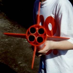 The MkV was my first cluster design. It's made from a 55mm cardboard postal tube with 1mm thick balsa fins and a balsa nose cone. It's powered by four 18mm engines. They have to be C's . . . really!