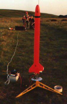 MkV engine mountsAfter consulting with the guys on r.m.r I've made a new ignition system. It's based around two 6v lead-acid batteries ( wired in series to give 12v), so I shouldn't have any problems with clustering. The batteries sit very close to the launch pad, so that the clip whips are fairly short. It has two sets of clips to make connection to the four igniters easier. Both the battery station and the remote hand station have keyswitches and red LEDs to indicate when they are active. In addition the hand station has a momentary push button to activate the launch. To keep the diameter of the cable connecting the remote hand station to the battery station down to a manageable size, there is a relay mounted in the battery station. This requires only negligible current to activate. Total parts cost, about £12 excluding the batteries ( which were given to me by Richard 'dodgy contractor' Robinson).