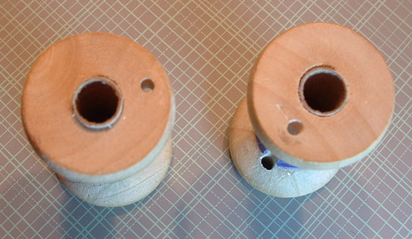 scratch_micromax-spool_launchrodholesBuilding the rocket was not quite as simple as it could get, but it was close. A Micromaxx motor fits loosely into the 7/8 inch spool's center hole and with a few wraps of masking tape, you could just friction fit the motor into it and go. But I didn't want to even have to bother with doing that, so I constructed a motor mount for my spool. The center hole just happened to be the same diameter as the OD of FlisKits BT-2.5 which is the tubing used to make the motor tubes for their "Micro To The Maxx" line of MMX® kits. I already had some of this tubing on hand so I simply cut a length of it that was equal to the height of the spool - 30mm. Next I used a toothpick to apply a small bead of Elmer's Glue-All® about 3/16 of an inch into one end of the tube. Using a spent Micromaxx motor that I had glued onto the end of a bamboo skewer, I pushed a FlisKits EB-2.5® engine block into the tube from the other end until the end of the motor was almost flush with the end of the tube (I left about 1/32 of an inch hanging out) and then quickly withdrew the spent motor. I let the glue cure for awhile before proceeding.