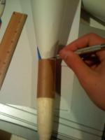 Next, make the motor mount. First, role the cardstock into a cone. Make sure the BT-20 will fit snugly in the opening. Use tape to hold this cone in place. Coat the inside with wood glue and the outside with CA. Us wood glue to secure the MMT tube inside this shroud.