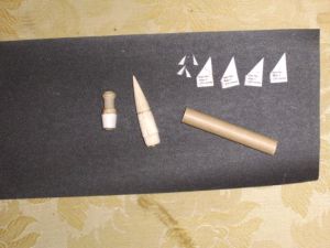 In the picture you can see the tail cone and engine mount as well as the other parts ready for assembly. I did not have ready-made centering rings, so I made those too, again using the CR tools on EMRR. A caution here, these things are seriously tiny. Balsa simply will not let you cut it this small and remain held together. Each piece had to be papered on both sides and coated with thin superglue in order to be shaped and sanded. This was a lot of work and from now on I will spend the money to buy these parts whenever possible. The fins are also a little difficult to work with because of their size, but papering both sides allowed me to work with them without major hassles.