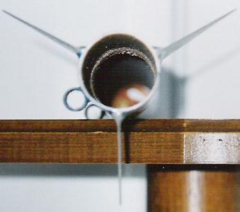 Next I filled the airframe spirals with Fix-It epoxy clay which took a while because it was rather slow going. Once all the spirals were filled I sanded the airframe and marked it for three fins using the fin alignment page in the Handbook of Model Rocketry. I then attached the fins using USA Gold CA after which I filleted them with West System Epoxy with colloidal silica. At the same time I epoxied the Econo-Jet spacer come motor block into the rear of the airframe using a G80 casing for spacing. I wanted the motor as far up as possible to keep the rocket stable, although I had it stick out a 1/4" just so you had something to grab onto for removal.