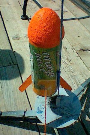 I used a 16 fluid oz orange juice container, foam Easter egg, 3 tongue depressors, bread bag (parachute), and lots of glue. To make the foam egg fit, I had to carve down the butt, this was a simple task with a kitchen knife. To make the egg more durable, I used 4 coats of Elmer’s glue. This was a unique look for the rocket as sealed foam makes the nose cone look like an orange rind. I had problems getting the tongue depressors (wings) to stay attached, so I had to change over to a bonding epoxy instead of modeling glue. The only item that needed to be purchased was a engine tube since I could not find a free substitute. The bread bag for a parachute was great, durable, and the best price.