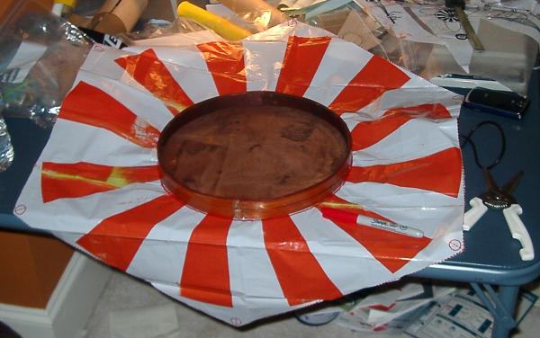 Cut out the plastic parachute from the sheet. In addition, cut out a 12" round section from the middle to form a giant spill hole. This is needed to reduce the size of the parachute to fit the 24mm body tube but also provides theoretically better stability and deployment.