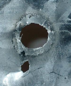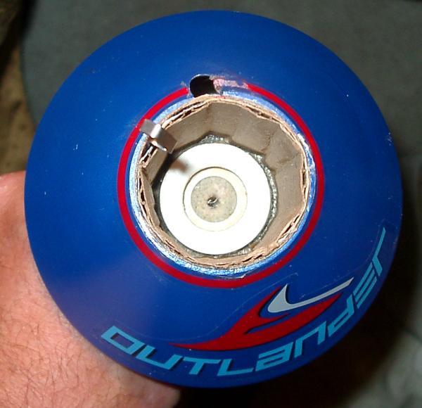 Nothing else was damaged - the rocket was in perfect shape except for the shock cord. The pad however was not so lucky. The roasting pad didn't make a good blast shield - there was a perfectly round hole in the surface - just as if someone had turned a plasma torch on it. (above right) My inexperience using improvised blast shields luckily didn't result in a fire - I had cleared the ground under the pad down to the ground and the constant rain had everything well soaked.