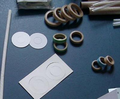 Do not punch out the paper rings. Take one of each of the three components and using wood glue glue these so that each ends up as a ring with one BT5 and one BT20 paper centering ring on the top / bottom of the BT55/BT50 ring. These will form the core of the top and bottom cover of the altimeter bay.