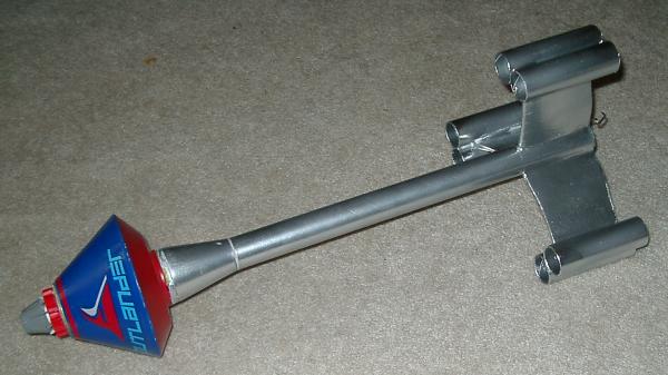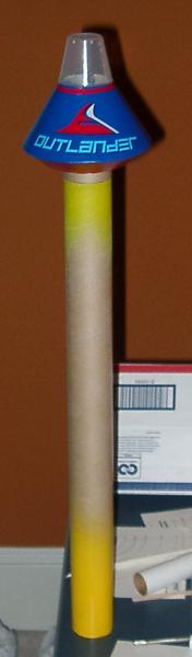 This made simulations easier - there was no longer a need for nose weight to make things stable. On the other hand - it was hard to determine how to simulate the rocket. In addition, the partial nose didn't have anything in the front. I decided to build it and use the space for an electronics bay. As I began to simulate various fins I realized my only large fin-stock was air foiled like a glider or airplane wing. This asymmetric airfoil could work and it would mean that the rocket would spin if I played my cards right. The spin induced might even add a little extra stability - which could be needed due to the potential for the nosecone to blank the fins in its wake. As things came I decided that pods on the end of the wings were a necessary part of the way this rocket would look. I tried building various pods in RockSIM and on the table in mockup's - but nothing was working until I stumbled into the idea of using TWO 24mm tubes together at the end of each fin. This was partially required because I am lousy at cutting the wood perfectly at a 90 degree angle so the pods didn't want to be quite perpendicular to the main body - and partially because it allowed me to try placing BT5 body tubes out on the ends of each fin for potential clustering. The BT5's looked awful... and they went the way of the Dodo. Thus the design for Outland'ish was born... Outland'ish is an MPR rocket made using an Estes Outlander upper section as a nosecone. The idea was to create something that might have graced a 70's or 80's Omni cover. Something a little odd looking as a traditional rocket but still recognizable as a rocket nevertheless. The rocket's main attraction besides the big nose is the altimeter/timer bay built into the nose and disguised as a bit of space technology - perhaps a sensor or weapons array. Using this bay electronics can be flown in this lightweight MPR rocket. A spare engine hook is used to ensure that the altimeter bay is not lost. NOTE: Weight Listed is without motor or altimeter but with Parachute and altimeter bay in place.
