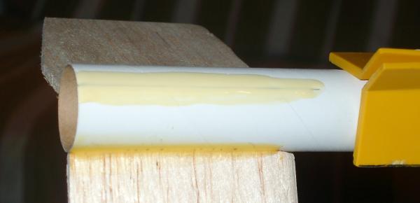 Wait 30 mins or so depending on the wood glue until the glue skins enough that it will not run. Rotate the rocket 120 degrees and repeat. Keep doing this until all three sides are completed.