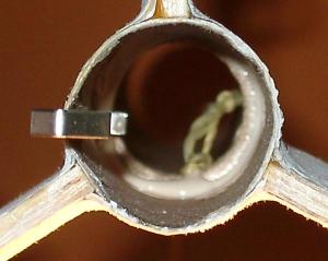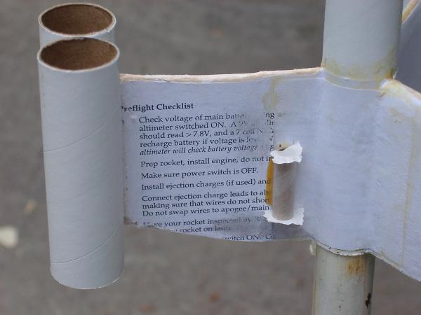 First impressions can be deceiving. As I looked closer I saw that the motor was hanging halfway out of the rocket - the engine hook hadn't retained the engine completely (right). With nothing else looking amiss I picked up the rocket and intended to fly it again. As I began to prepare to pack the shock cord into the rocket - I realized that the cord was nearly broken in two. The shock cord was the cotton covered elastic that I hate but it was what I had in my box. It appeared that somehow the sheath material had been scorched enough to separate. Luckily the elastic under the cover had not been damaged and so the rocket was saved.
