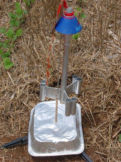 Now I'm not a BAR - I didn't have any rocket experience until about 2 years ago. I'm used to flying off the club pads not off my Estes pad. But since I was trying to squeeze a flight in over lunch - the Estes pad was my only real option. Unfortunately my blast shield was missing, so I improvised and used a disposable aluminum roasting pan - more on this later.