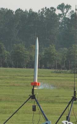 My rocket turned out to be the last HPR rocket of the day. The suspense was killing me. This would be my last chance to qualify for level one for at least two months so I was quite nervous. When the LCO called off the countdown and the igniter sputtered I thought I was cooked. But then the motor caught and the boost was perfect--nearly straight up with very minor wind induced weathercocking. The rocket appeared to go up to around 1000' and right around apogee the motor ejected.
