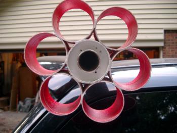 I used the full length of the Postal Tube so no cutting was required. For the Tube fins I cut the tube using a hand saw in a miter box. Next I took a spare 3" x 30" tube section (actually a leftover from a previous rocket that didn't fly well) and I cut six 3" long sections from this. These sections were sanded and checked against one another to assure that they were close to the same length. I decided to mount these flush with the rear of the tube to make it easy to stand the rocket up without a stand. The tube sections were glued to the rocket using 5 minute epoxy. An added benefit of tube fins is that you get very strong attachments due to the fact that each tube is glued in three places (to the main tube and both adjoining tubes).