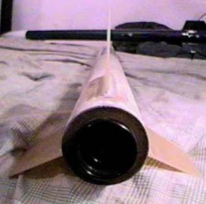 I wanted to build a rocket with the smallest fins I could get away with.....So I came up with this. I used Rocsim, VCP and WRASP to get my optimal size fin. Oddly enough, most of the programs agreed with my rocket. This is a single stage rocket, with an interchangeable MMT. Anything from 54mm down to 24mm motors will push this little guy. It uses a PML 30" chute with the shroud ...