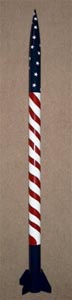 The upper section was next. I masked off the area from the top stripes down, then began working on the stars. I used Paintshop Pro to make the stars, then printed them out on paper. The stars were cut out in paper strips, 8 at a time and placed and scotch taped down over a 1" thick strip of masking tape which was laid on a cutting board. I used a Exacto to cut out each star from the masking tape and placed them in the appropriate positions. 4 coats of Krylon Dark blue were painted over the upper section and nosecone and left to sit overnight. Then I removed the masking tape stars and viewed the final product for finish.
